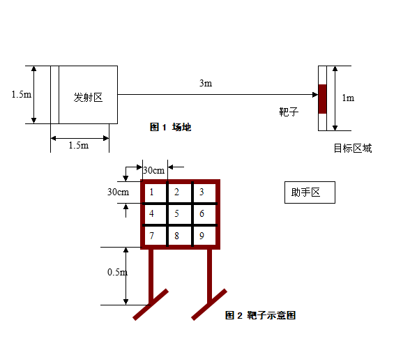 评比要求: 1、射中目标(每射入得分框1次,可得2分,最多40分) (说明:在3米外发射装置,射入1~9号框均可得2分) 2、发射装置的创意分。(1~20分)